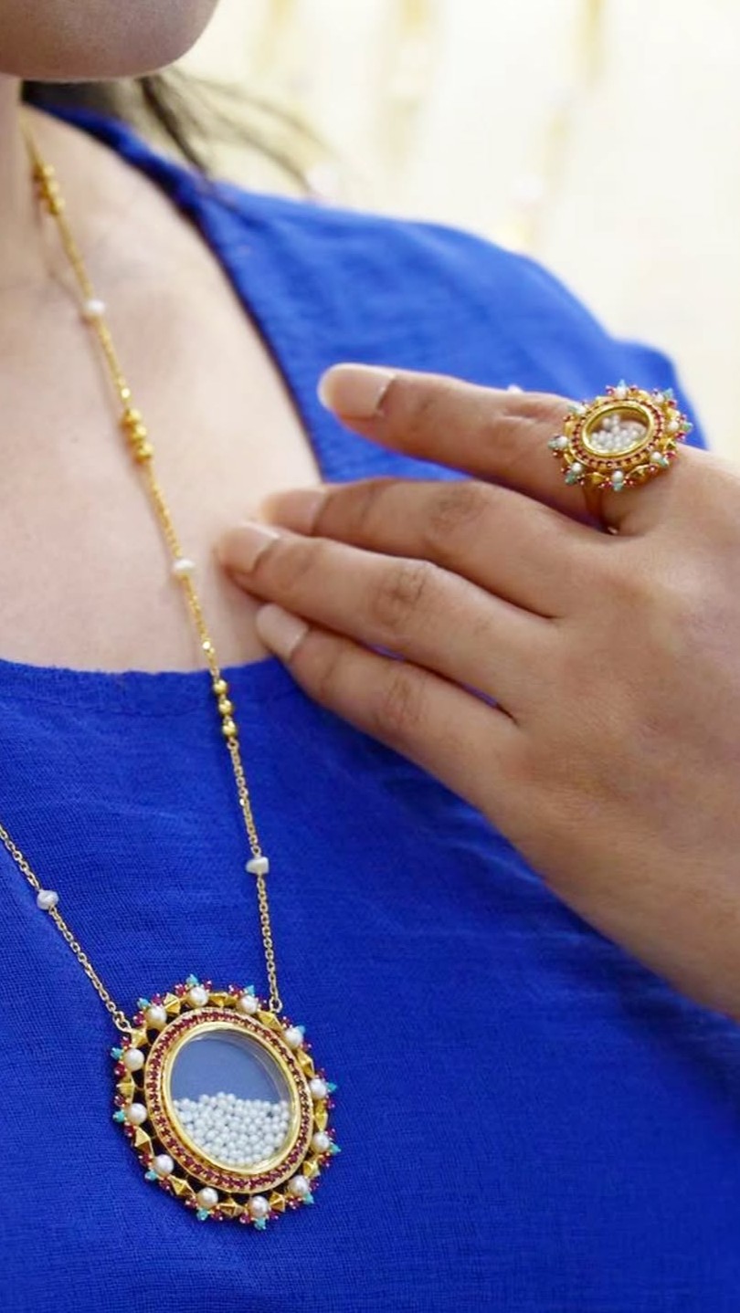 21-karat gold set with natural Bahraini pearls, rubies, and turquoise