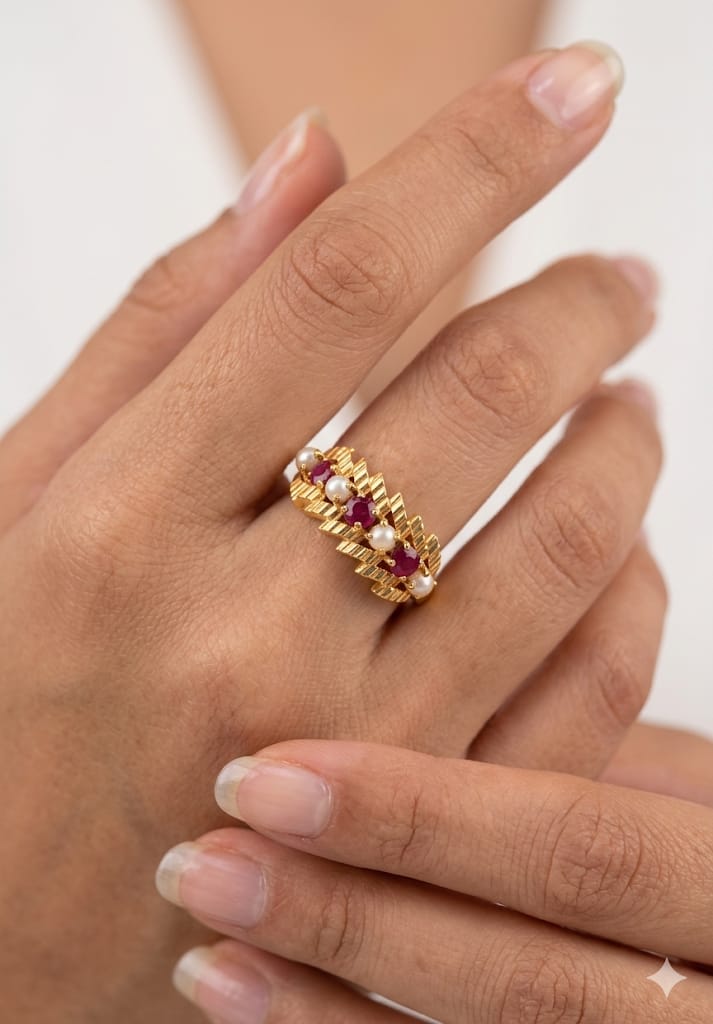 21-karat gold ring with natural Bahraini pearls and rubies