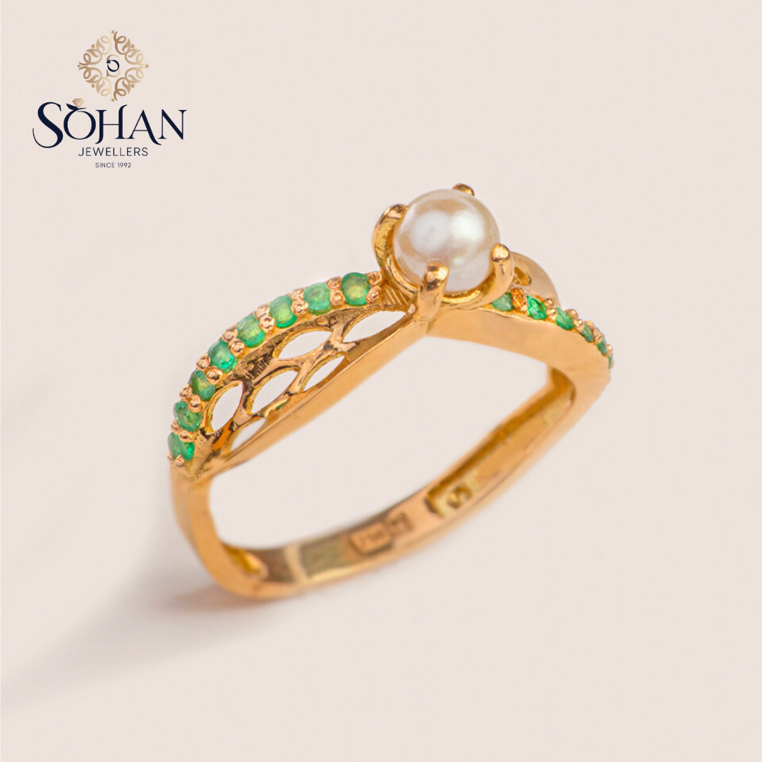 Bahraini Pearl Garland Ring – The Bahraini Pearl Garland Ring by Sohan Jewellers features a graceful strand of lustrous pearls arranged in a garland-inspired design. Celebrating Bahrain’s pearling heritage, this ring embodies elegance, tradition, and timeless charm.