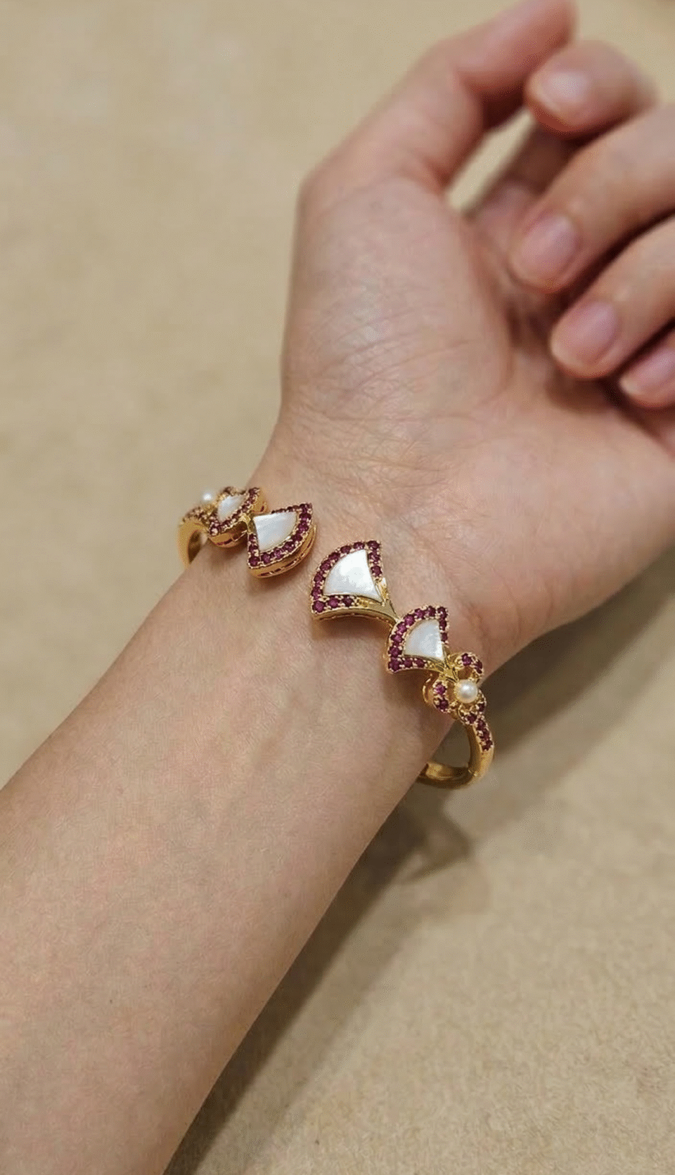 21-karat gold bangle with natural Bahraini pearls, sadaf and ruby stones