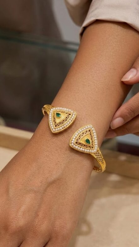 21-karat gold bangle with natural Bahraini pearls and emeralds