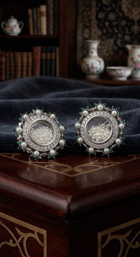 18-karat white gold earrings with natural Bahraini pearls, sapphires, and emeralds